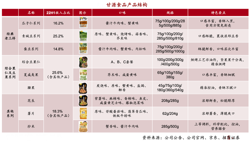 經(jīng)典案例:根據(jù)公司公告、公司官網(wǎng)、京東和招商證券等綜合資訊表明,甘源食品公司產(chǎn)品主要包含老三樣(瓜子仁、青豌豆、蠶豆系列)、綜合果仁及豆果系列、其他(花生、玉米、麥片等),其中經(jīng)典老三樣22H1占比約為56%,但增速相對(duì)放緩。21年公司開(kāi)始加大新品開(kāi)發(fā)推廣,夏威夷果仁、花生、豆果、米餅等新品市場(chǎng)反饋不錯(cuò),綜合果仁及豆果系列和其他系列占比持續(xù)提升,22H1分別占比 26%、18%。
