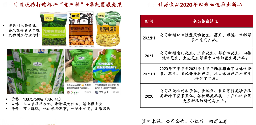 經(jīng)典案例:根據(jù)公司公告、小紅書、招商證券等綜合資訊表明,甘源食品在成立之初就開(kāi)始專注探索堅(jiān)果深加工處理,在行業(yè)內(nèi)率先使用獨(dú)立手抓包規(guī)格并開(kāi)拓引入蟹黃味、芥末味等新式口味,已成功樹(shù)立老三樣標(biāo)桿產(chǎn)品地位,先發(fā)優(yōu)勢(shì)十分明顯。同時(shí)2020年以來(lái)公司持續(xù)延伸擴(kuò)充 品類,陸續(xù)推出多種花生、口味性堅(jiān)果、烘焙類及膨化類食品,加速新品布局上市。