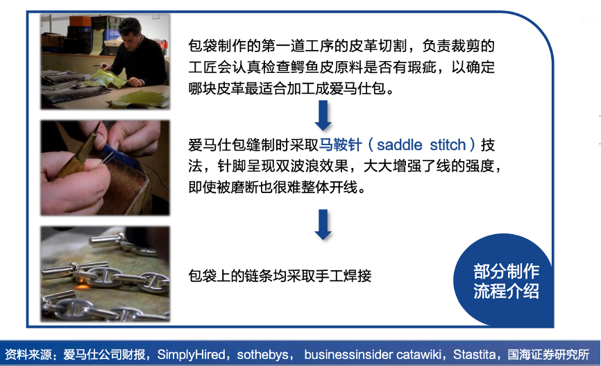 經典案例:根據愛馬仕公司財報、SimplyHired、sothebys、businessinsider catawiki、Stastita、國海證券研究所等綜合資訊表明,愛馬仕始終堅持精心手工制作每一件包袋和絲綢,以滿足客戶的個性化定制需求。由于整個制作流程均由人工完成,制作一個Kelly包平均約需要 25小時,一個Birkin包至少需要18小時,一個制造廠每月僅能生產15只 愛馬仕包。