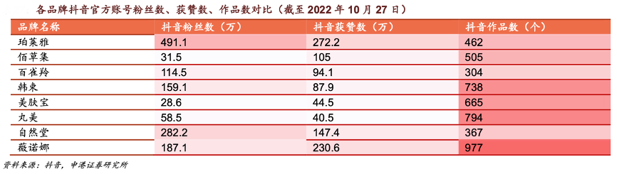經(jīng)典案例:根據(jù)抖音、申港證券研究所等綜合資訊表明,珀萊雅在天貓平臺(tái)夯實(shí)大單品策略,塑造明星產(chǎn)品,力圖提升自播比重,并進(jìn)行會(huì)員拉新和復(fù)購(gòu)運(yùn)營(yíng)的升級(jí)。對(duì)比珀萊雅及其競(jìng)品抖音官方旗艦店數(shù)據(jù)發(fā) 現(xiàn),珀萊雅以 491.1 萬(wàn)粉絲數(shù)量、272.2萬(wàn)獲贊數(shù)位居第一,以 462 個(gè)抖音作品數(shù)處于中游,說明其平均單個(gè)作品獲贊數(shù)較高。