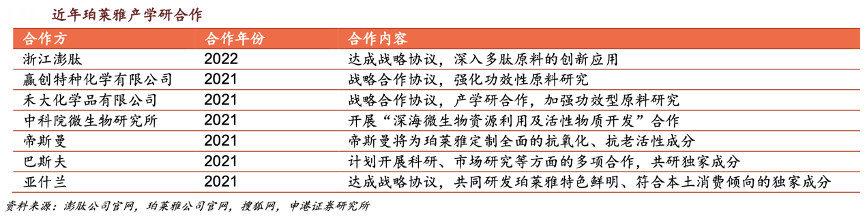 經(jīng)典案例:根據(jù)澎肽公司官網(wǎng)、珀萊雅公司官網(wǎng)、搜狐網(wǎng)、申港證券研究所等綜合資訊表明,珀萊雅捕捉到消費(fèi)者對(duì)于護(hù)膚品成分關(guān)注度的提升,與海內(nèi)外研發(fā)實(shí)驗(yàn)室開展原料研發(fā)合作。2022年珀萊雅與浙江澎肽展開戰(zhàn)略合作,深入多肽研發(fā)、多肽綠色合成等方面的創(chuàng)新研發(fā)。2021 年與贏創(chuàng)特種、禾大化學(xué)、中科院微生物研究所、帝斯曼、巴斯夫、亞什蘭開展合作,共同研發(fā)優(yōu)質(zhì)原料與科學(xué)配方。