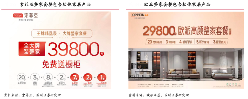 經典案例:根據索菲亞、歐派家居、國聯(lián)證券研究所等綜合資訊表明,歐派、索菲亞等進軍整家領域,對軟體成品企業(yè)造成部分沖擊。歐派衣柜事業(yè)部 2021 年推出的 29800 元整家套餐,除了包含 20 平米的價值 19800 元的定制柜子外, 還包含 10 件價值為 10000 元的軟體成品家具,軟體產品以接近成本價出售。