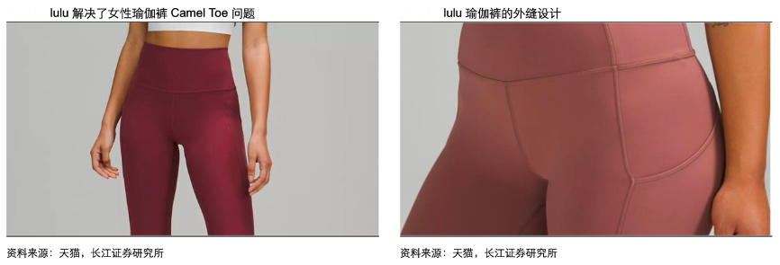 經(jīng)典案例:根據(jù)天貓、長江證券研究所等綜合資訊表明,lululemon開創(chuàng)性研發(fā)了由 86%尼龍和 14% 萊卡組成的Luon 面料,解決了瑜伽褲的延展度不足、透明性問題以及舒適度不足問題。同時(shí),其剪裁方面,通過襠部無縫剪裁及菱形內(nèi)襯設(shè)計(jì),解決了瑜伽褲的 Camel Toe 問題,使得 lululemon 產(chǎn)品在戶外運(yùn)動(dòng)場景也能適用;早期開創(chuàng)性地斥資 8 萬美元引進(jìn)兩臺(tái) 日本平鎖縫紉機(jī),將內(nèi)縫置于身體外部,解決接縫線頭在瑜伽運(yùn)動(dòng)過程中對(duì)身體摩擦的不適感。