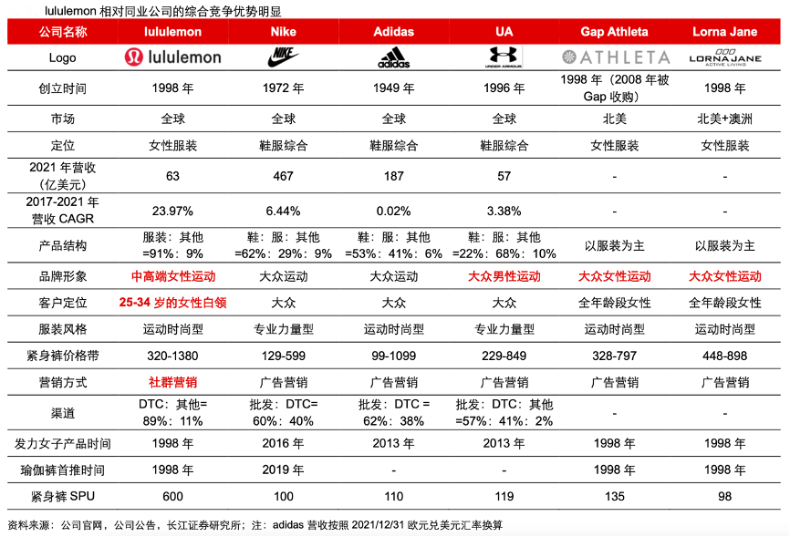 經(jīng)典案例:根據(jù)公司官網(wǎng)、公司公告、長江證券研究所等綜合資訊表明,lululemon 品牌定位與客戶定位最為匹配,而 Nike 和 UA 由于過于男性的品 牌形象無法精準(zhǔn)匹配女性客戶群體,Adidas 則由于品牌過于綜合以及營銷不到位,女子 產(chǎn)品難以有效傳達(dá)至目標(biāo)消費(fèi)群體。因而lululemon 在高端女性運(yùn)動(dòng)服裝領(lǐng)域具有較強(qiáng)的綜合優(yōu)勢。