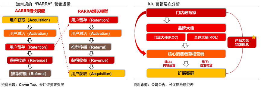 經(jīng)典案例:根據(jù)Clever Tap、公司公告、長江證券研究所等綜合資訊表明,“門店教育家”是 lululemon 的獲客起點,其招募來的門店大使(主 要是瑜伽、健身教練)以其在垂直領(lǐng)域的影響力天然影響學(xué)員購買 lulu 的產(chǎn)品,學(xué)員及 粉絲(高粘性客群)因產(chǎn)品本身的功能性、舒適度與時尚度,及其傳達(dá)的生活理念自發(fā) 拓展到其社交圈層,以此帶來 lulu 客戶群的進(jìn)一步擴(kuò)大。