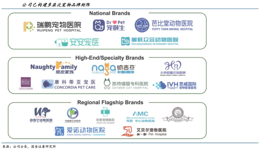 經(jīng)典案例:根據(jù)公司公告、國金證券研究所等綜合資訊表明,截至 2021 年底,新瑞鵬公司擁有 23 個寵物醫(yī)院品牌,其中國內(nèi)醫(yī)院數(shù)量排名前 20 的品牌中有 13 個。品牌家族分為三個層次:1)全國品牌,具備全國影響力和綜合能力;2)區(qū)域 旗艦品牌,即所在省市的主要寵物醫(yī)院;3)高端/專業(yè)品牌,迎合寵物父母的不同需求和消費水平。
