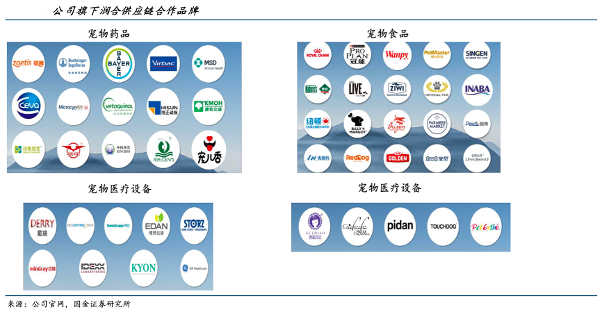經(jīng)典案例:根據(jù)公司官網(wǎng)、國金證券研究所等綜合資訊表明,新瑞鵬簽約多家頭部優(yōu)質(zhì)品牌,大規(guī)模采購保證對上游議價力。其與渴望、皇家等頭部優(yōu)質(zhì)寵物產(chǎn)品食品、藥品、設(shè)備等知名品牌深度合作,通常比其他市場提前六個月到一年確保新產(chǎn)品供應(yīng),并獨家獲得優(yōu)質(zhì)品牌的熱門產(chǎn)品,相較競爭者供應(yīng)鏈穩(wěn)定和價格相對優(yōu)勢明顯。截至2022Q3,其已經(jīng)覆蓋 100 多個主要城市的高效供應(yīng)鏈網(wǎng)絡(luò)。