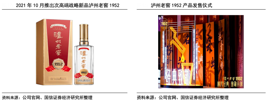 經(jīng)典案例:根據(jù)公司官網(wǎng)、國(guó)信證券經(jīng)濟(jì)研究所等綜合資訊表明,2021年10 月瀘州老窖公司推出次高端戰(zhàn)略新品瀘州老窖 1952(52 度 500ml),建議零售價(jià) 899 元,一方面意在補(bǔ)充布局 600-800 元價(jià)格帶,完善產(chǎn)品矩陣,與低度老窖共同加碼次高端市場(chǎng);另一方面也是瀘州老窖品牌復(fù)興的重要一環(huán),希望借此產(chǎn)品拉升瀘州老窖品牌的形象。新品名稱(chēng)寓意致敬 1952 年瀘州老窖在全國(guó)第一屆評(píng)酒會(huì)上奪得“四大名酒”稱(chēng)號(hào),被譽(yù)為濃香酒的典型代表、酒中泰斗。