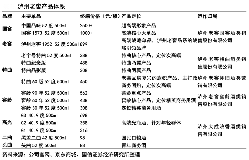 經(jīng)典案例:根據(jù)公司官網(wǎng)、京東商城和國(guó)信證券經(jīng)濟(jì)研究所等綜合資訊表明,2018年瀘州老窖公司確立“雙品牌、三品系、大單品”全價(jià)格帶覆蓋的品牌戰(zhàn)略,其中“雙品牌”即國(guó)窖 1573 和瀘州老窖,“三品系”即高中低檔,“大單品”包括國(guó)窖1573、特曲、窖齡、頭曲、二曲,以及近兩年推出的戰(zhàn)略新品瀘州老窖 1952 和高光。
