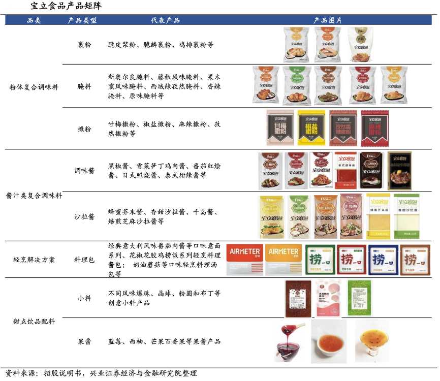經(jīng)典案例:根據(jù)招股說明書、興業(yè)證券經(jīng)濟與金融研究院等綜合資訊表明,寶立食品公司早期客戶為百勝供應(yīng)商,如泰森,正大食品等肯德基上游雞肉加工廠商均為客戶,以黃金雞塊裹粉發(fā)展至今。公司產(chǎn)品主要分為三大類,且不斷開拓創(chuàng)新,每年向客戶提供千余種單品。其中的輕烹解決方案主要包括意面、撈飯等系列料理醬包以及各口味料理湯包。