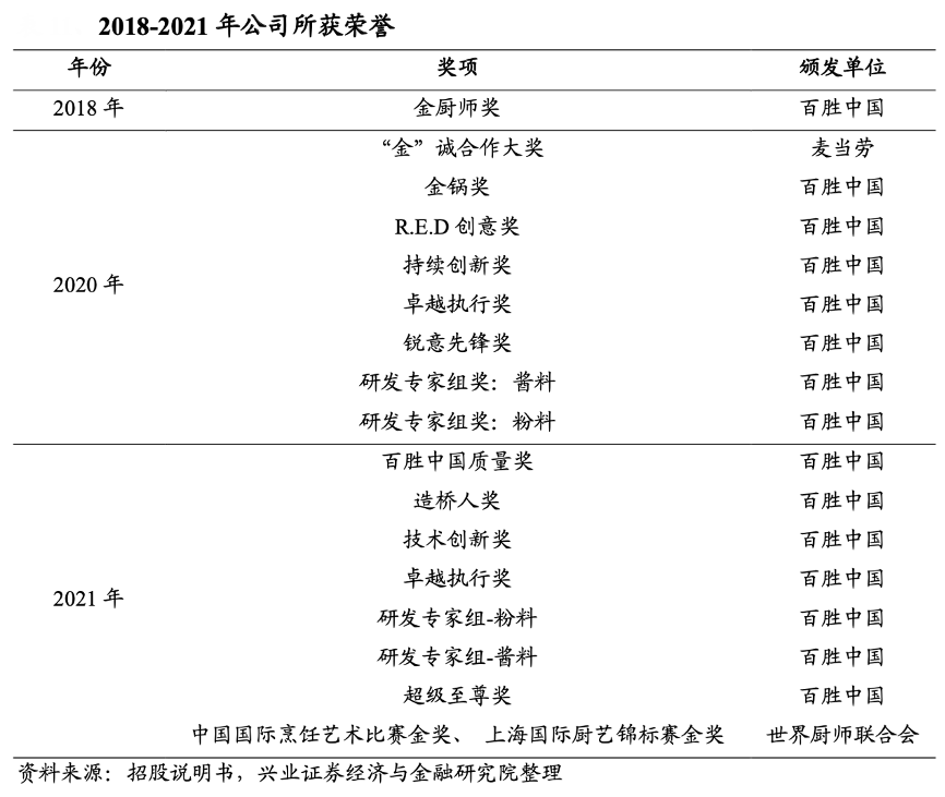 經(jīng)典案例:根據(jù)招股說明書、興業(yè)證券經(jīng)濟與金融研究院等綜合資訊表明,寶立食品公司及公司主要團隊人員多次被客戶授予優(yōu)質(zhì)供應(yīng)商相關(guān)榮譽,如百勝中國“造橋人獎”、“金鍋獎”,被麥當(dāng)勞頒予 “‘金’誠合作大獎”等。