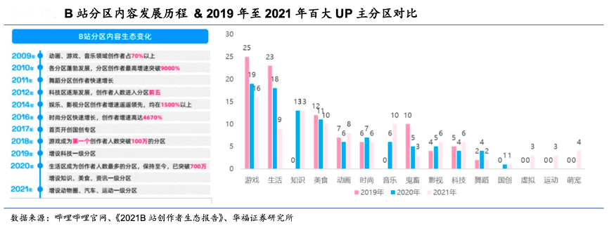 經(jīng)典案例:根據(jù)嗶哩嗶哩官網(wǎng)、《2021 B站創(chuàng)作者生態(tài)報(bào)告》、華福證券研究所等綜合資訊表明,2019 年是 B 站破圈元年,包括舉辦2019 年跨年晚會(huì)《bilibili 晚會(huì):2019 最美的夜》、購(gòu)買《英雄聯(lián)盟》全球總決賽 S10 至S12(2020 年至 2022 年)的中國(guó)獨(dú)家直播權(quán)、邀請(qǐng)明星、學(xué)術(shù)大咖和社會(huì)機(jī)構(gòu) 進(jìn)駐等破圈動(dòng)作都卓有成效,促進(jìn)了社區(qū)本身內(nèi)容品類的多元化。對(duì)比 2021 年與 2019 年的 B 站百大 UP 主,UP 主們的背景更加多元化,所在的分區(qū)數(shù)量從 9 個(gè)增加到 15 個(gè),新增了虛擬、萌寵、運(yùn)動(dòng)、音樂(lè)、國(guó)創(chuàng)和知識(shí) 6 個(gè)板塊。