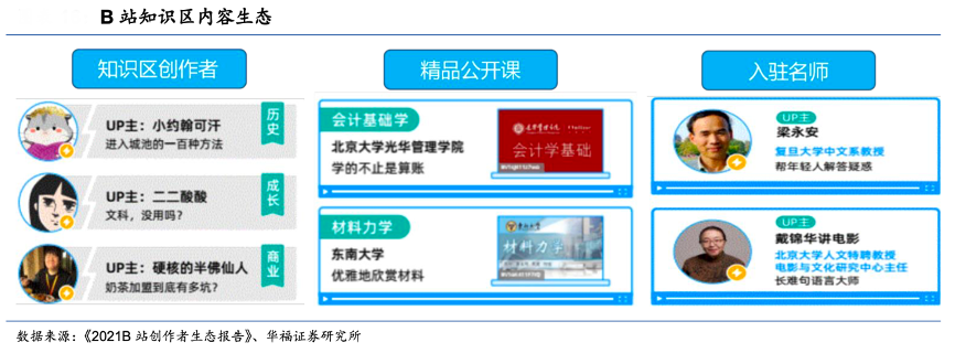 經(jīng)典案例:根據(jù)《2021 B站創(chuàng)作者生態(tài)報(bào)告》、華福證券研究所等綜合資訊表明,目前 B 站知識(shí)區(qū)已經(jīng)發(fā)展成為 B 站流量最大的分區(qū),2021 年, 泛知識(shí)內(nèi)容在 B 站總播放量占比達(dá)到了 45%,超過(guò) 300 位名師學(xué)者(包括中國(guó)科學(xué) 院院士汪品先、屢次出圈的法學(xué)教授羅翔等)入駐 B 站,有 1.9 億用戶在 B 站觀看泛知識(shí)類視頻,相當(dāng)于中國(guó)在校大學(xué)生數(shù)量的 5 倍。