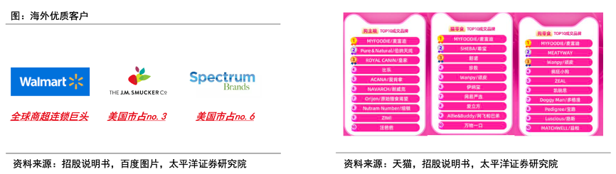 經(jīng)典案例:根據(jù)天貓、百度圖片、招股說明書、太平洋證券研究院等綜合資訊表明,乖寶公司前五大客戶包含沃爾瑪、SMUCKER、 Spectrum Brands,客戶資源優(yōu)質。其合作平臺包含 天貓/京東/抖音等,自主品牌“麥富迪”天貓雙11品牌銷量第一,狗主糧/零食品類第一,充分受益線上紅利。
