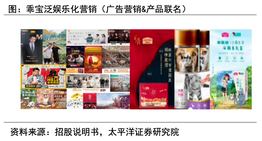 經(jīng)典案例:根據(jù)招股說明書、太平洋證券研究院等綜合資訊表明,乖寶公司積極投入營銷,采取泛娛樂化策略:明星代言、合作電視/游戲等文娛節(jié)目,孵化線上新媒體平臺社區(qū)達人 (KOL),打造泛娛樂化聯(lián)名產(chǎn)品,定位年輕消費群體,營造“有貓有狗就 有麥富迪”的品牌理念。