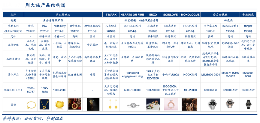 經(jīng)典案例:根據(jù)公司官網(wǎng)、華創(chuàng)證券等綜合資訊表明,周大福在黃金首飾及產(chǎn)品FY2018-2022年復合增長率6.6%,珠寶鑲嵌類則因黃金首飾產(chǎn)品與鐘表類占比上升,占比有所下降,占比約21.7%,其中 T MARK 因獨特定制模式收入持續(xù)提升。