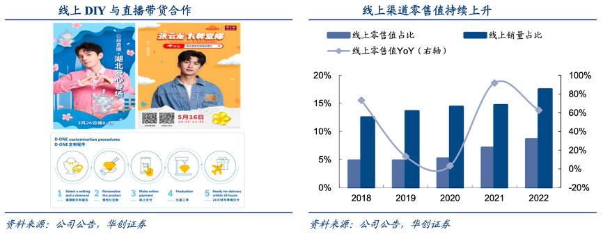 2020 年初,公司推出“云商 365”微信小程序, 將客戶引流到公司網(wǎng)絡(luò)旗艦店,通過小程序連接顧客與員工,顧客透過手機享受一站式服務(wù)。隨著 2020 年“云商 365”與“云柜臺”的推出,F(xiàn)Y2021/FY2022 線上零售值占比相對大幅增大,分別為 7.1%/8.6%,同 增 2.1%/1.5%。