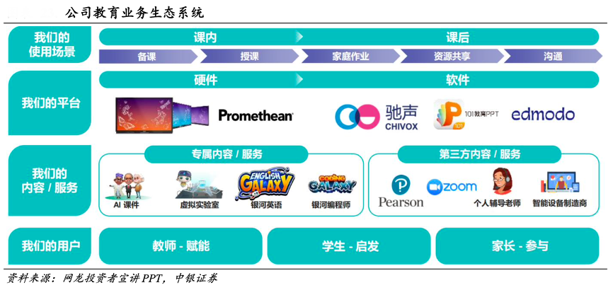 經(jīng)典案例:根據(jù)網(wǎng)龍投資者宣講PPT、中銀證券等綜合資訊表明,網(wǎng)龍公司目前已經(jīng)基本覆蓋了整個(gè)混合式學(xué)習(xí)細(xì)分場(chǎng)景,形成了較為完善的教育科技生態(tài)系統(tǒng):硬件產(chǎn)品擁有“普羅米修斯”“智慧教室”等,軟件端擁有學(xué)習(xí)平臺(tái) “Edmodo”、語(yǔ)音人工智能“馳聲”、教師備課工具 “101 教育 PPT”等,內(nèi)容端擁有“AI 課件”、“虛擬實(shí)驗(yàn)室”、“銀河英語(yǔ)”、“銀河編程師”等品牌 ;此外還與第三方進(jìn)行合作,如將獨(dú)有的在線輔導(dǎo)平臺(tái)與 Zoom 結(jié)合等。