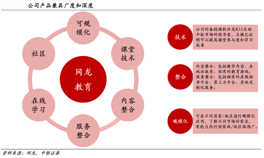 經(jīng)典案例:根據(jù)網(wǎng)龍、中銀證券等綜合資訊表明,網(wǎng)龍公司產(chǎn)品兼具廣度和深度,在內(nèi)容端和技術(shù)端都具備優(yōu)勢(shì)。技術(shù)方面,公司堅(jiān)持深入研發(fā),研發(fā)成果已證明可以提高課堂參與度和學(xué)習(xí)效果;服務(wù)整合方面,公司提供多種服務(wù)整合,如將獨(dú)有的在線輔導(dǎo)平臺(tái)與 Zoom 結(jié)合,也提供國(guó)家級(jí)定制化需求整合服務(wù);內(nèi)容整合方面,公司可將自有課件、 游戲、本地出版商內(nèi)容等多維度產(chǎn)品進(jìn)行整合,進(jìn)而形成市場(chǎng)特色的一站式混合學(xué)習(xí)解決方案,具備較強(qiáng)市場(chǎng)競(jìng)爭(zhēng)力。因此公司解決方案可以較為容易的進(jìn)行復(fù)制化和規(guī)?;?,根據(jù)不同市場(chǎng)的需求實(shí)現(xiàn)高效率的市場(chǎng)推廣。