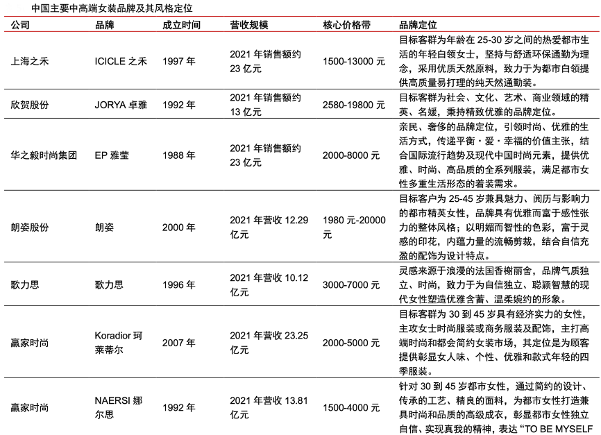 經(jīng)典案例:根據(jù)各公司官網(wǎng)、公司公告、各品牌天貓官方旗艦店、中信證券研究部等綜合資訊表明,國內(nèi)中高端女裝品牌大多目標(biāo)客群為 25 到 40 歲都市女性,大致可以分為商務(wù)、時尚、潮流三類 品牌定位,核心價格帶集中于 2000 到 5000 元之間。其中規(guī)模超過 10 億元的中高端女裝 品牌數(shù)量較少,贏家時尚(珂萊蒂爾、娜爾思)、地素時尚(DAZZLE、d'zzit)旗下分別擁有 2 個超 10 億女裝品牌。