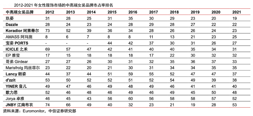 經(jīng)典案例:根據(jù)Euromonitor、中信證券研究部等綜合資訊表明,結(jié)合Euromonitor 數(shù)據(jù),過去 10 年我國女性服飾品牌中,多數(shù)中高端女裝品牌市占率呈現(xiàn)提升趨勢,其中玖姿、珂萊蒂爾、 之禾等國產(chǎn)品牌表現(xiàn)突出,2021 年市占率分別居 19、23、31 位,相比 2012 年分別提升 12、50、38 位。