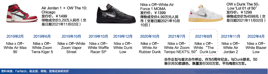 經(jīng)典案例:根據(jù)Farfetch、鞋友派、得物、國(guó)海證券研究所等綜合資訊表明,2017年, NIKE與OFF-WHITE首次合作,共合作十款球鞋。企劃主題為「The Ten: Icons Reconstructed by Virgil Abloh」,合作產(chǎn)品包括 Air Jordan 1、Nike Air Max 90、Nike Air Vapor Max 和 Nike Blazer Mid等。Air Jordan 1 off white Chicago為該系列最受關(guān)注球鞋,發(fā)行價(jià)為1499元。據(jù)得物APP顯示,Chicago在2021年 11月29日成交價(jià)為3.29萬(wàn)元人民幣,超出原價(jià)20倍。Nike x Off-White Air Force 1 MOMA為該系列最貴球鞋,展出于紐約現(xiàn)代藝術(shù)博物館,得物最新成交價(jià)為4.99萬(wàn)元 (交易日期2021年10月10日)。