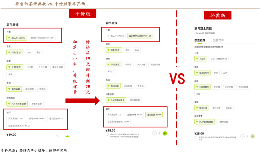 經(jīng)典案例:根據(jù)品牌點(diǎn)單小程序、德邦研究所等綜合資訊表明,奈雪的茶有選擇的降價(jià),經(jīng)典款價(jià)格穩(wěn)定,平價(jià)版杯量減少或小料降級(jí)。對(duì)比降價(jià)前后產(chǎn)品價(jià)格,可以發(fā)現(xiàn)奈雪經(jīng)典款價(jià)格基本穩(wěn)定,部分降價(jià)是通過對(duì)經(jīng)典單品分量、小料“降級(jí)”實(shí)現(xiàn),在保持品牌調(diào)性的基礎(chǔ)上,提供消費(fèi)者更多元選擇。