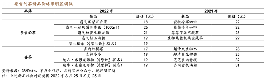 經(jīng)典案例:根據(jù)CBNData、單點(diǎn)小程序、品牌官方公眾號(hào)、德邦研究所等綜合資訊表明,奈雪的茶新品價(jià)格全面調(diào)低,降低用戶嘗新門檻為品牌引流。奈雪新品已基本接近中端茶飲品牌對(duì)應(yīng)單品價(jià)格。以葡萄果茶為例,奈雪的茶“霸氣葡萄”大杯 23 元,茶百道“紫喜葡 萄凍凍”大杯 18 元、一點(diǎn)點(diǎn)“葡萄柚綠”大杯 18 元、CoCo“星空葡萄”大杯 20 元。