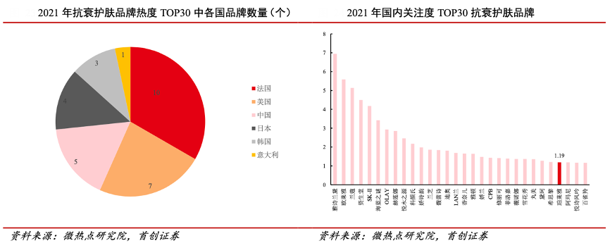 經(jīng)典案例:根據(jù)微熱點研究院、首創(chuàng)證券等綜合資訊表明,在消費(fèi)者關(guān)注度較高的抗衰品牌中,仍以國際品牌主導(dǎo)。關(guān)注度 TOP30 的抗衰品牌中,法國、 美國、中國品牌數(shù)量分別為 10、7、5 個,日韓緊隨其后。
