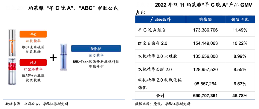 經(jīng)典案例:根據(jù)公司公告、魔鏡、華福證券研究所等綜合資訊表明,珀萊雅于 2020 年 2 月和 4 月接連推出主打抗皺淡紋功效的紅寶石精華、主打抗氧抗糖功效的雙抗精華,通過(guò)雙抗精華和紅寶石精華組合塑造“早 C 晚 A”科學(xué)抗衰公式(即早晨使用雙抗系列抗氧化+晚上使用紅寶石系列抗衰老),2021年 2 月又順勢(shì)推出主打修護(hù)維穩(wěn)的源力精華,擴(kuò)展至“ABC”護(hù)膚組合,科學(xué)抗衰形象深入人心。