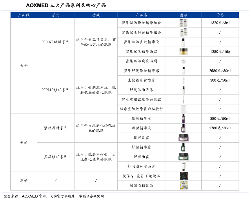 經(jīng)典案例:根據(jù)AOXMED官網(wǎng)、天貓官方旗艦店、華福證券研究所等綜合資訊表明,貝泰妮集團(tuán)于 2022 年 7 月推出 AOXMED 璦科縵,該品牌由貝泰妮集團(tuán)經(jīng) 10 余年匠心研發(fā)而成。 AOXMED 定位高奢級(jí)抗衰,主價(jià)格帶在千元以上;產(chǎn)品主打“為專(zhuān)業(yè)美容而生,專(zhuān)注皮膚年經(jīng)化”,具有抗衰老、抗氧化、消炎抗菌等功效;核心成分為自研專(zhuān)利組合“美雅安緹 MLYAAT-1002”,突破性作用于皮膚老化的不同層面,實(shí)現(xiàn)長(zhǎng)期持續(xù)性?xún)?nèi)源抗老。