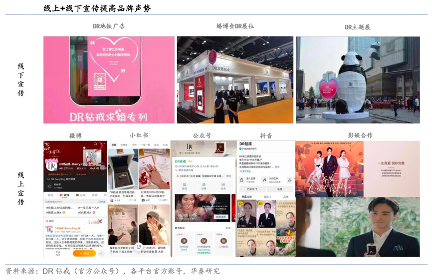 經(jīng)典案例:根據(jù)DR鉆戒(官方公眾號)、各平臺官方帳號、華泰研究等綜合資訊表明,DR公司通過打造全渠道營銷矩陣,實現(xiàn)消費者的廣泛觸達:在線下通過在商場地鐵等地進行廣告投放、開展線下主題展、婚博會等方式提升品牌曝光度,在線上則通過在社交媒體平臺、電商平臺等開設品牌專區(qū)投放廣告,邀請明星合作以及在影視劇中植入廣告等方式實現(xiàn)全方位的市場推廣。