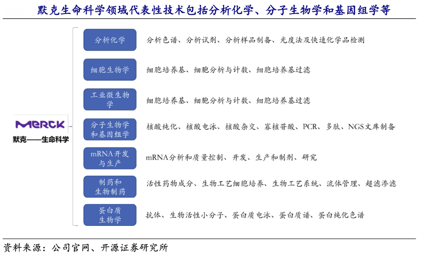 經(jīng)典案例:根據(jù)公司官網(wǎng)、開源證券研究所等綜合資訊表明,默克是行業(yè)領(lǐng)先的科技公司,專注于生命科學(xué)、醫(yī)藥健康、電子科技三大業(yè)務(wù)。具體到生命科學(xué)而言,默克旗下的默克密理博是生命科學(xué)行業(yè)三大供應(yīng)商之一,由生命科學(xué)部、實(shí)驗(yàn)室方案部和過(guò)程方案部三個(gè)部門組成,主要為生命科學(xué)行業(yè)提供 創(chuàng)新性工具和解決方案,提供制藥、臨床診斷、蛋白質(zhì)研究、細(xì)胞生物學(xué)及實(shí)驗(yàn)室 所需要的各類儀器耗材產(chǎn)品。