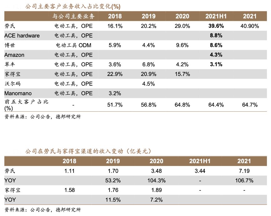 經(jīng)典案例:根據(jù)公司公告、德邦研究所等綜合資訊表明,泉峰公司與勞氏深度綁定,截至 21H1,公司前五大客戶收入占比為 64.4%,分 別為勞氏(39.6%)、ACE hardware(8.8%)、Bosch(8.6%)、亞馬遜(4.3%)、 翠豐(3.1%),其中公司主要為 Bosch 提供電動工具的 ODM 業(yè)務(wù)。2021年作為與勞氏建立戰(zhàn)略合作伙伴關(guān)系后的第一個完整運營年,公司在勞氏渠道的收入達到 7.2 億美元,占比為 40.9%。