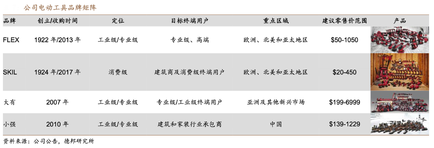 經(jīng)典案例:根據(jù)公司公告、德邦研究所等綜合資訊表明,泉峰公司目前擁有 FLEX、SKIL、大有、小強(qiáng)四個(gè)電動(dòng)工具品牌,其中 FLEX、大有、 小強(qiáng)專注于專業(yè)級(jí)/工業(yè)級(jí)產(chǎn)品,SKIL 專注于消費(fèi)級(jí)電動(dòng)工具。公司 2007 年、2010 年推出大有、小強(qiáng)電動(dòng)工具自有品牌,分別針對(duì)高端專業(yè)以及建材家居裝修市場(chǎng); 2013 年收購 FLEX、2017 年收購 SKIL,重點(diǎn)突破北美歐洲等海外市場(chǎng)。