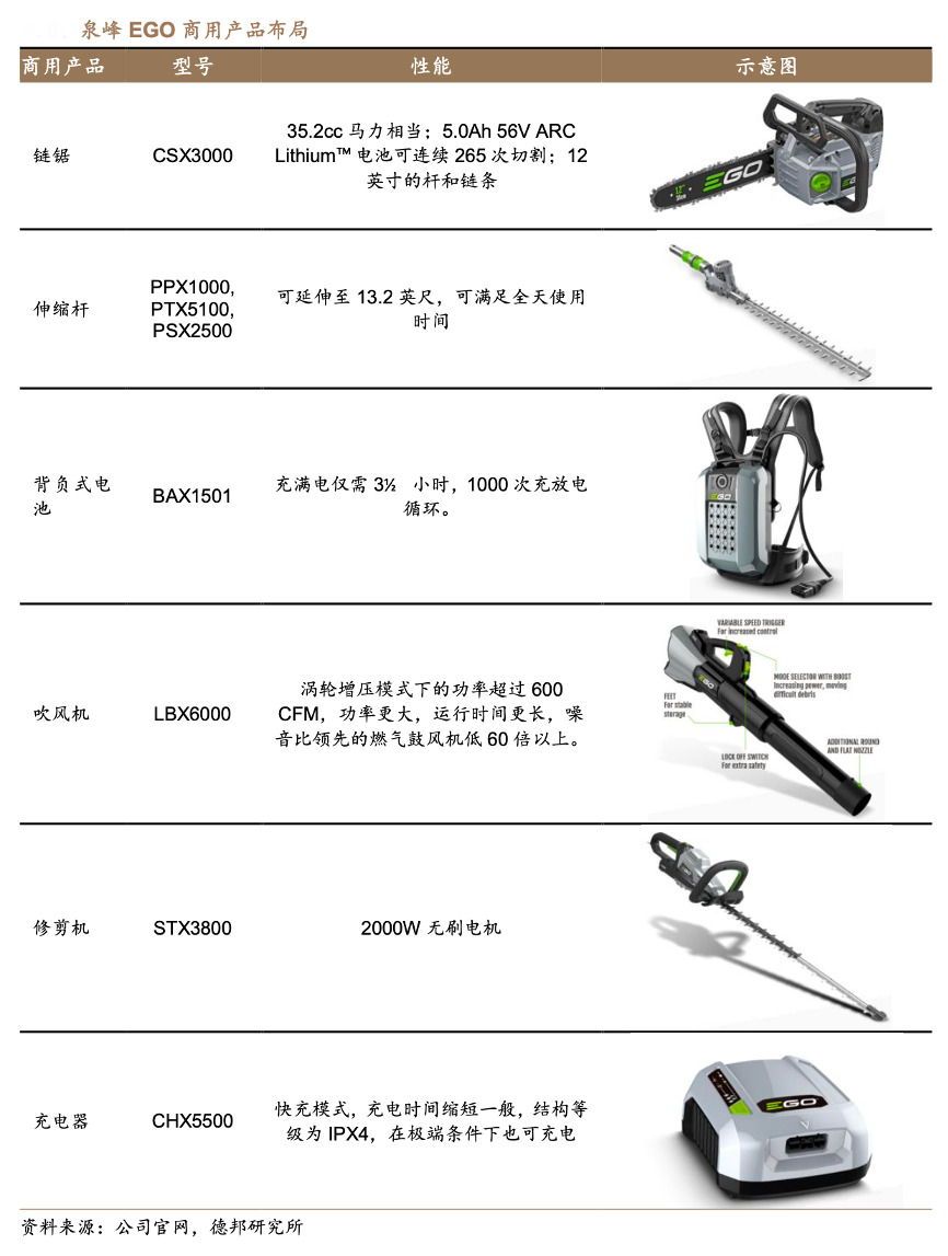 經(jīng)典案例:根據(jù)公司官網(wǎng)、德邦研究所等綜合資訊表明,泉峰EGO 目前產(chǎn)品主要為家用產(chǎn)品,面向高端消費(fèi)群體,平均售價(jià)遠(yuǎn)高于大眾市 場(chǎng)產(chǎn)品,率先推出全球首臺(tái)兼容電池平臺(tái)鋰電 ZTR 騎乘式割草車。公司同時(shí)也布局了商用領(lǐng)域,包括商用鏈鋸、商用伸縮桿、商用背負(fù)式電池 包、充電器、吹風(fēng)機(jī)、修枝機(jī)等產(chǎn)品。