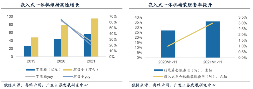 經(jīng)典案例:根據(jù)奧維云網(wǎng)、廣發(fā)證券發(fā)展研究中心等綜合資訊表明,蒸烤一體機(jī)市場快速發(fā)展,精裝房配套率提升。以嵌入式蒸烤一體機(jī)為例,市場規(guī) 模保持高速增長。奧維云網(wǎng)數(shù)據(jù)顯示,零售渠道,嵌入式蒸烤一體機(jī)近兩年銷額、銷量復(fù)合增速分別達(dá)到43.5%、40.7%,2021全年銷售額達(dá)到56億元,同比增長26.7%; 銷量達(dá)到95萬臺(tái),同比增長20.3%。