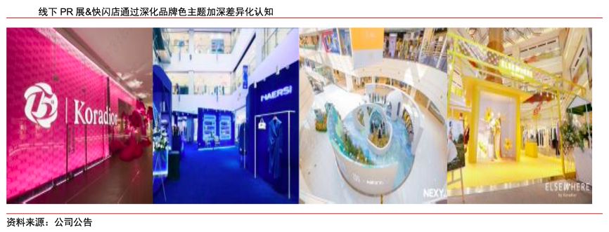 經(jīng)典案例:根據(jù)公司公告、中信證券研究部等綜合資訊表明,贏家時(shí)尚將品牌色、品牌花融入產(chǎn)品設(shè)計(jì)及線下營(yíng)銷,加深差異化認(rèn)知。以三大核心品牌為例,其賦予各品牌代表色,例如珂萊蒂爾玫紅、娜爾思 25 度藍(lán)、奈蔻綠、珂思黃,并在產(chǎn)品設(shè)計(jì)上融入玫瑰、百合、蘭花等品牌花賦予品牌差異化內(nèi)涵,結(jié)合線下場(chǎng)景深度植入,對(duì)各大品牌做清晰區(qū)分,打造差異化認(rèn)知。
