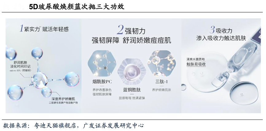 經(jīng)典案例:根據(jù)夸迪天貓旗艦店、廣發(fā)證券發(fā)展研究中心等綜合資訊表明,夸迪的代表性單品“5D玻尿酸煥顏藍(lán)次拋”2019年首次采用當(dāng)時(shí)公司新科技5D透明質(zhì)酸技術(shù),創(chuàng)新復(fù)配使用了5種分子量不同的透明質(zhì)酸。“5D玻尿酸煥顏藍(lán)次拋”采用多重玻尿酸的復(fù)配以及超活玻尿酸,取代了當(dāng)時(shí)市面上常見的甘 油成分,實(shí)現(xiàn)產(chǎn)品成分的創(chuàng)新,打開新的市場(chǎng)空間。