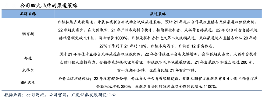 經(jīng)典案例:根據(jù)公司財(cái)報(bào)、公司官網(wǎng)、廣發(fā)證券發(fā)展研究中心等綜合資訊表明,潤(rùn)百顏多渠道并進(jìn)增長(zhǎng),通過(guò)拓寬渠道多點(diǎn)觸達(dá)用戶,持續(xù)布局新渠道,將抖音打造成第二大規(guī)模渠道,同時(shí)其開始布局線下渠道;而夸迪加強(qiáng)線下及私域渠道建設(shè),天貓平臺(tái)提升店鋪日銷及自播能力。