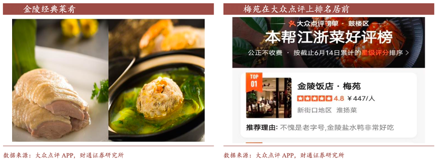 經典案例:根據大眾點評APP、財通證券研究所等綜合資訊表明,金陵飯店 共有七家餐廳,分別為璇宮餐廳、香江餐廳、太平洋餐廳、金海灣餐廳、梅苑餐 廳、櫻花苑餐廳以及金淼餐廳,其中,以梅苑餐廳最為著名。梅苑餐廳以正統(tǒng)淮 揚菜為基礎,經過其他菜系廚師的調整,形成了現(xiàn)代金陵菜。今天梅苑已是公認的淮揚菜殿堂之一,經典菜如金陵鹽水鴨、蟹粉獅子頭等受到當地居民及游客的認同。