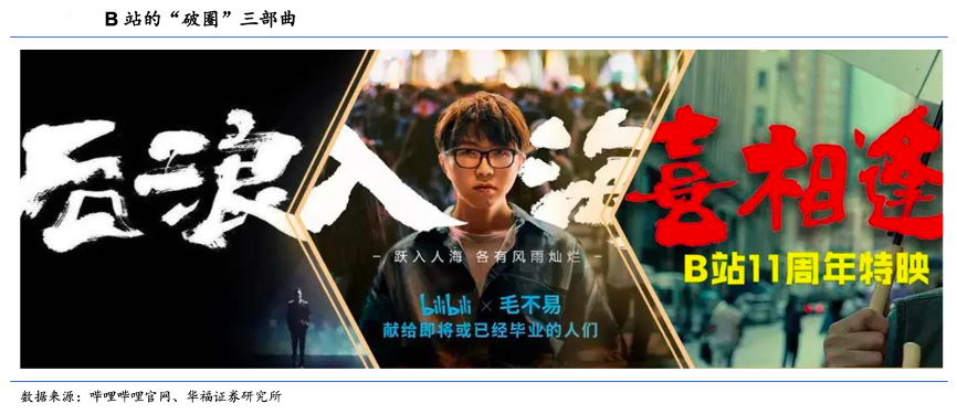 經(jīng)典案例:根據(jù)嗶哩嗶哩官網(wǎng)、華福證券研究所等綜合資訊表明,B站在 2020 年青年節(jié)發(fā)布宣傳視頻《后浪》,該視頻引起廣泛討論,獲得超 30 億的全網(wǎng)曝光量, 超 20 家主流電臺(tái)報(bào)道,App 單日下載量突破 14 萬(wàn)。B 站后又在 2020 年下半年發(fā)布 《入海》和《喜相逢》,共同構(gòu)成 B 站的“破圈三部曲”,三個(gè)視頻累計(jì)全網(wǎng)曝光量達(dá) 到 53.7 億次,讓 B 站在 14 到 35 歲的全國(guó)網(wǎng)民中的品牌認(rèn)知度提升至 60%,并且清晰地表達(dá)了 B 站新的品牌定位——你感興趣的視頻都在 B 站。
