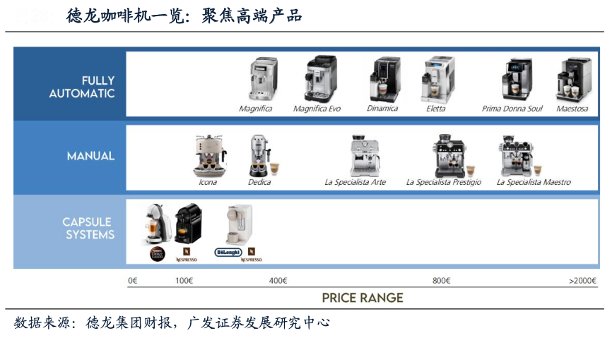 經(jīng)典案例:根據(jù)德龍集團(tuán)財(cái)報(bào)、廣發(fā)證券發(fā)展研究中心等綜合資訊表明,德龍集團(tuán)主營(yíng)業(yè)務(wù)為咖啡機(jī),2021年?duì)I收占比 達(dá)55%。德龍咖啡機(jī)產(chǎn)品豐富,涵蓋各價(jià)位,細(xì)分來看,德龍主要產(chǎn)品為價(jià)格較高的意式咖啡機(jī),占比合計(jì)73%;隨后為膠囊咖啡機(jī),占比24%。