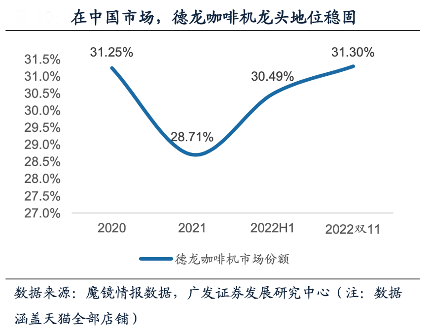 經(jīng)典案例:根據(jù)魔鏡情報(bào)數(shù)據(jù)、廣發(fā)證券發(fā)展研究中心等綜合資訊表明,在中國(guó)市場(chǎng),德龍咖啡機(jī)牢牢占據(jù)龍頭地位,份額遠(yuǎn)超第二名,份額在30%左右。