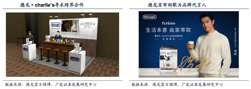 經(jīng)典案例:根據(jù)德龍官方微博、廣發(fā)證券發(fā)展研究中心等綜合資訊表明,2021年,德龍簽約胡歌為品牌代言人,提升品牌知名度,同時(shí)基于“跨界營銷”理念,不斷尋求出圈機(jī)會(huì),包括2021年7月德龍與廟前咖啡charlie’s 共同呈現(xiàn)咖啡與雞尾酒的跨界活動(dòng),以及2022年9月攜手上海東一美術(shù)館合作舉辦藝術(shù)展等。