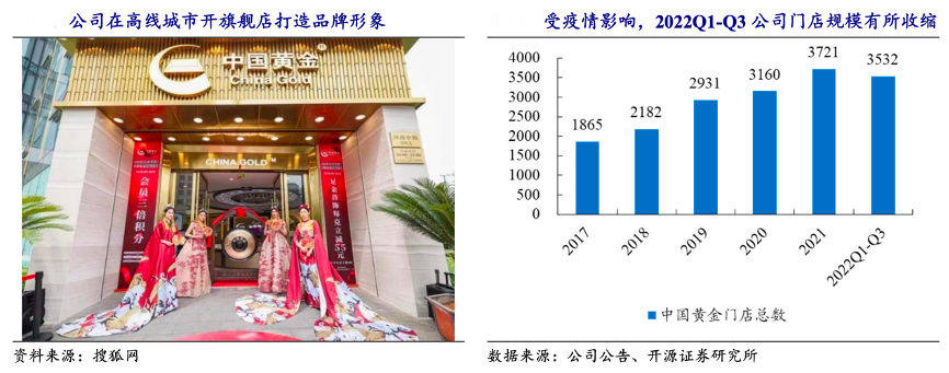 經(jīng)典案例:根據(jù)搜狐網(wǎng)、公司公告、開源證券研究所等綜合資訊表明,中國黃金公司深耕渠道擴(kuò)張,通過在高線城市核心商圈開旗艦店方式打造品牌形象,并發(fā)力加盟渠道、持續(xù)向下沉市場加速滲透。近年來,公司渠道規(guī)模增長迅速,門店數(shù)從 2017 年底的 1865 家增長至 2022 年 9 月底的 3532 家(2022Q4 預(yù)計(jì)新開 221 家加盟店),渠道規(guī)模已位列珠寶行業(yè)第一梯隊(duì)。