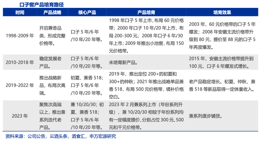 經(jīng)典案例:根據(jù)公司公告、云酒頭條、酒食匯、申萬宏源研究等綜合資訊說明,從產(chǎn)品培育路徑來看,口子窖公司前期培育出以年份系列為主的完整價(jià)格帶產(chǎn)品,2019 年后陸續(xù)推出新品迭代升級(jí),聚焦次高端及以上。2023 年,公司產(chǎn)品戰(zhàn)略繼續(xù)向上升級(jí),聚焦次高端及以上推出兼系列產(chǎn)品,對(duì)年份系列產(chǎn)品升級(jí)迭代。