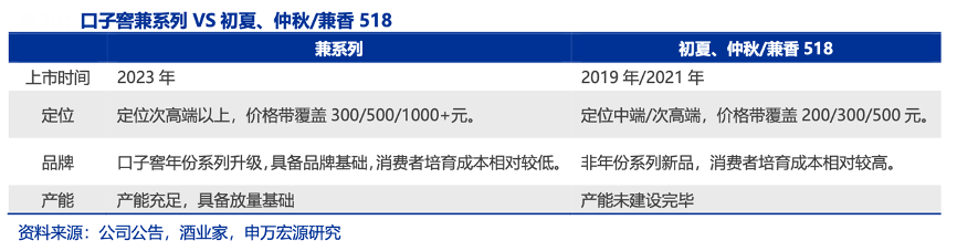經(jīng)典案例:根據(jù)公司公告、酒業(yè)家、申萬宏源研究等綜合資訊說明,對(duì)比上一輪產(chǎn)品升級(jí),口子窖兼系列主要具備以下差異:兼系列在保留口子窖經(jīng)典元素的基礎(chǔ)上,對(duì)品質(zhì)、價(jià)格、包裝和品牌進(jìn)行多重升級(jí),提出“自然兼香,非同凡享”的全新廣告語,突出品類優(yōu)勢。同時(shí),兼系列提價(jià)后兼 10/20/30 卡位 300/500/1000 元價(jià)格帶,契合安徽白酒向 300 元以上次高端升級(jí)趨勢,而上輪產(chǎn)品升級(jí)時(shí)行業(yè)主流價(jià)格帶并未升級(jí)到次高端以上。