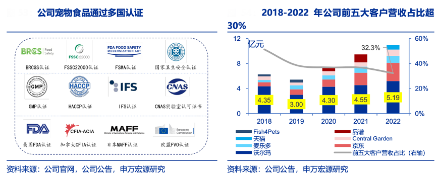 經(jīng)典案例:根據(jù)公司官網(wǎng)、公司公告、申萬宏源研究等綜合資訊表明,乖寶寵物公司已通過 BRCGS 等多個國內(nèi)外認證,并取得美國 FDA 等多個海外寵物食品消費大國官方機構(gòu)的認可,產(chǎn)品質(zhì)量符合美國、加拿大、日本、歐洲 等進口國家和地區(qū)質(zhì)量標準;同時,2018年以來公司前五大客戶營收占比保持在 30%以上,其中第一大客戶沃爾瑪(2022 年銷售額為 5.2 億元,占前五大客戶銷售金 額的 47%)自 2014 年起持續(xù)與公司合作,除 2019 年外,采購規(guī)模均持續(xù)增長。