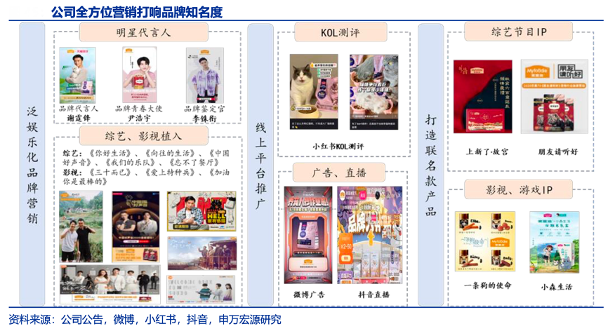 經(jīng)典案例:根據(jù)公司公告、微博、小紅書、抖音、申萬宏源研究等綜合資訊表明,乖寶寵物主要通過聘請明星代言人、在紀錄片、綜藝及影視作品中植入品牌宣傳、贊助動物公益活動等方式。具體措施有:邀請知名歌手、演員如謝霆鋒 擔(dān)任公司形象代言人;與綜藝節(jié)目、影視劇集和手機游戲等合作,充分利用其流量打造品牌知名度等。